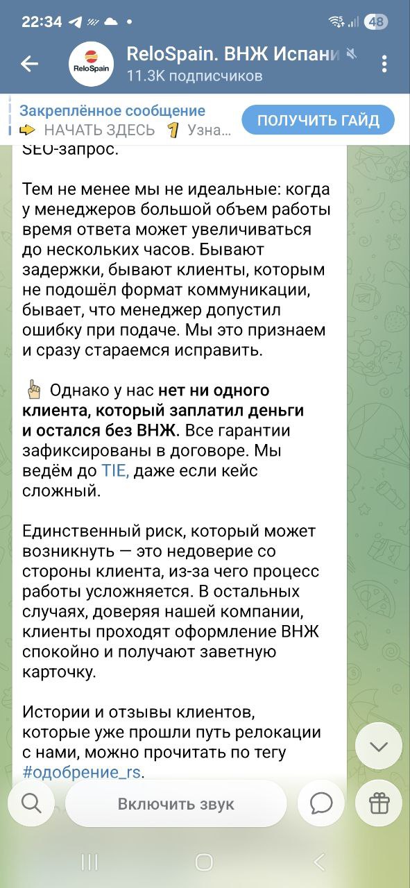 После блокировки мы не сильно расстроились, и вступили в чат, где общаются клиенты фирмы, с другого аккаунта. Буквально через пару дней мы увидели в этом чате свежий отзыв Сергея (ник @miseg465 в Телеграме), который пожаловался на то, что получил отказ в ВНЖ по стартапу, после чего менеджеры фирмы потеряли к нему всяческий интерес.